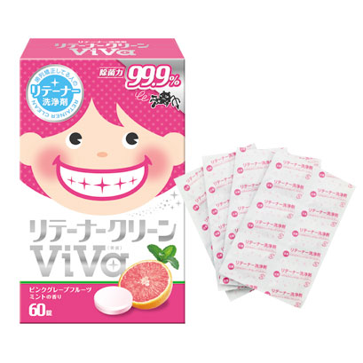 ※メーカー直送洗浄中はフレッシュなピンクグレープフルーツの香り、洗浄後は微かなミントの香りでクールな使用感が楽しめます。1錠を水(またはお湯)に入れ、リテーナーを5分間浸してすすぐだけの簡単スッキリ洗浄。今までの洗浄剤にはない、親しみやすいパッケージとさわやかな香りがポイントです。●入数:60錠